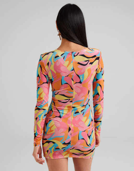 Bershka Fluwelen bodycon jurk met felle print en ringdetail in verschillende kleuren